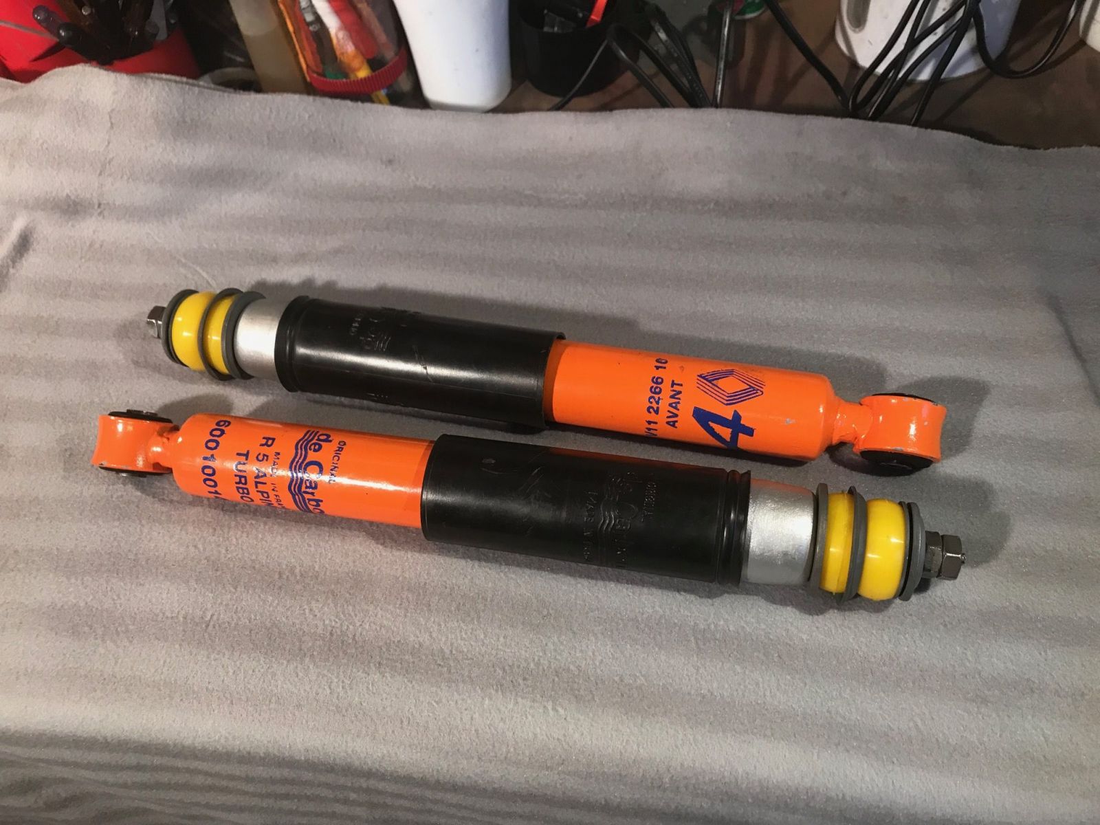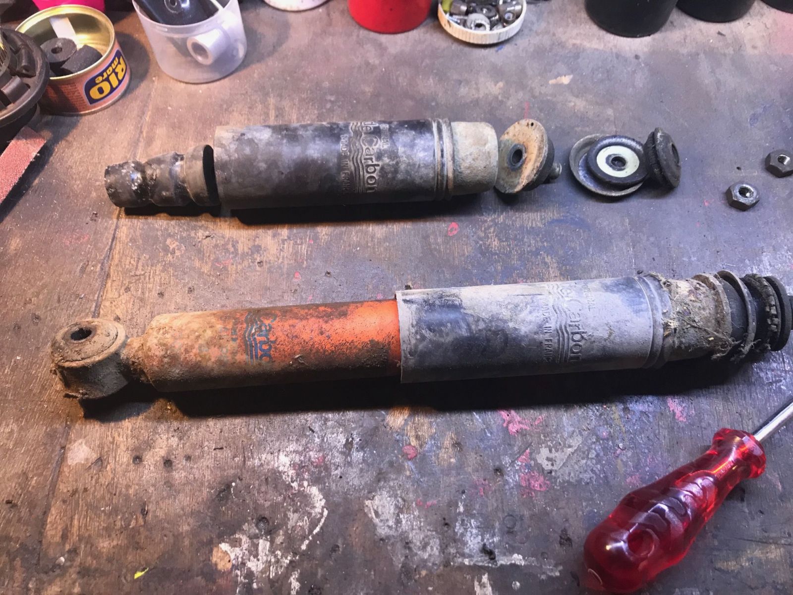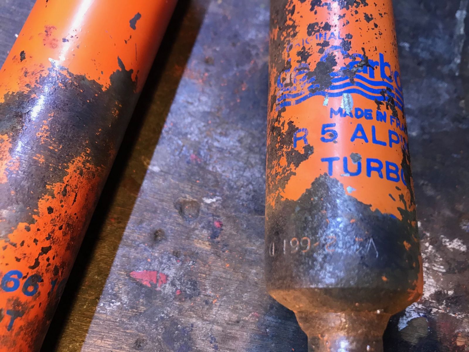 A címben szereplő első lengéscsillapítók egy donor autóból származnak, melyet Dani barátommal berheltünk ki a tavaly nyáron egy roncsból. Nagy kincs volt, hiszen ez egy gyári Renault cikkszámos deCarbon gátló pár volt, ezeket anno tunningként lehetett rendelni direkt az Alpine Turbókhoz, melyek a gyárinál keményebbek, progresszívebb rugózást kölcsönöztek az Alpine Turbóknak. Ezek most elég viharvert állapotban kerültek a műhely asztalomra.