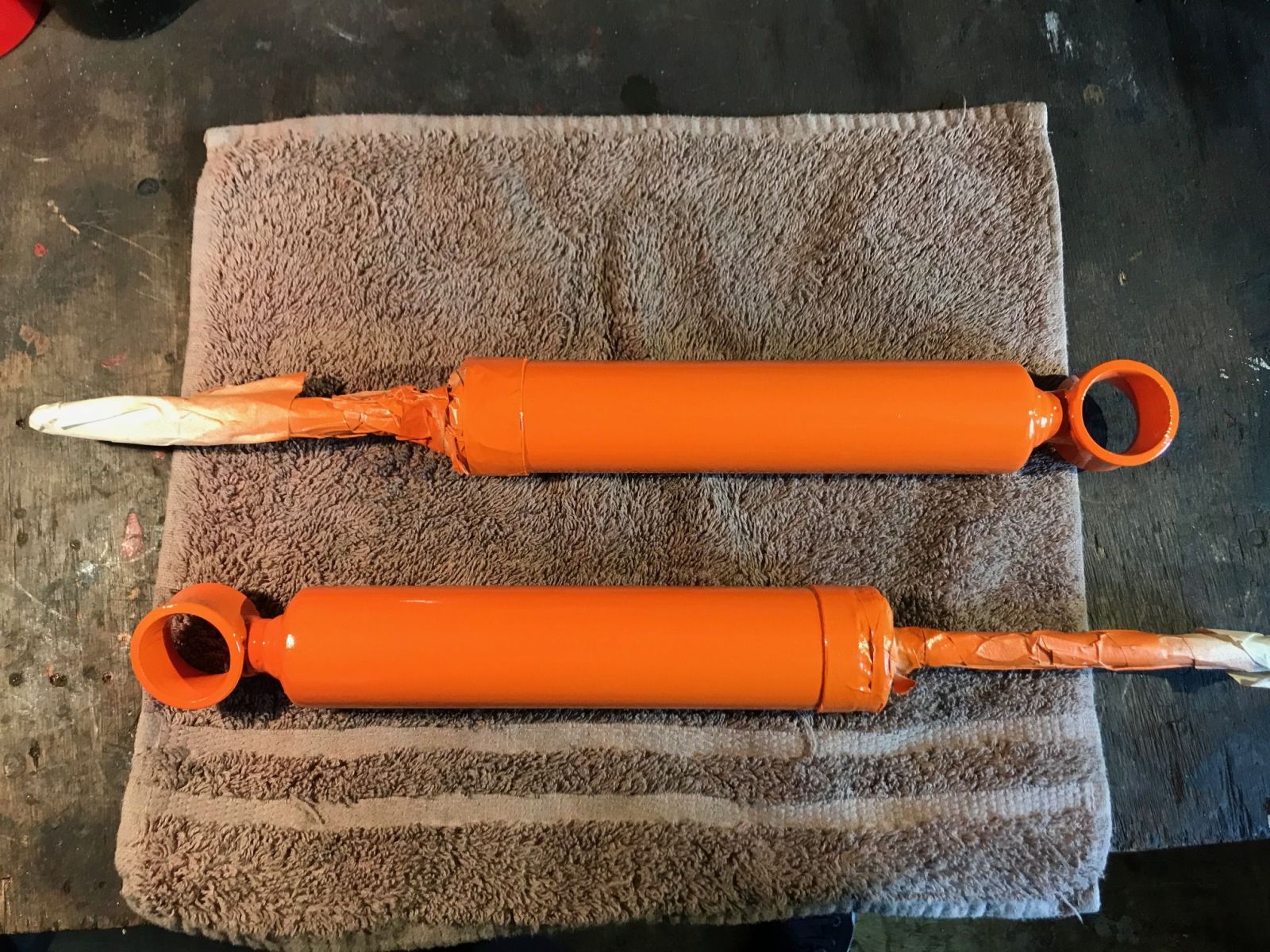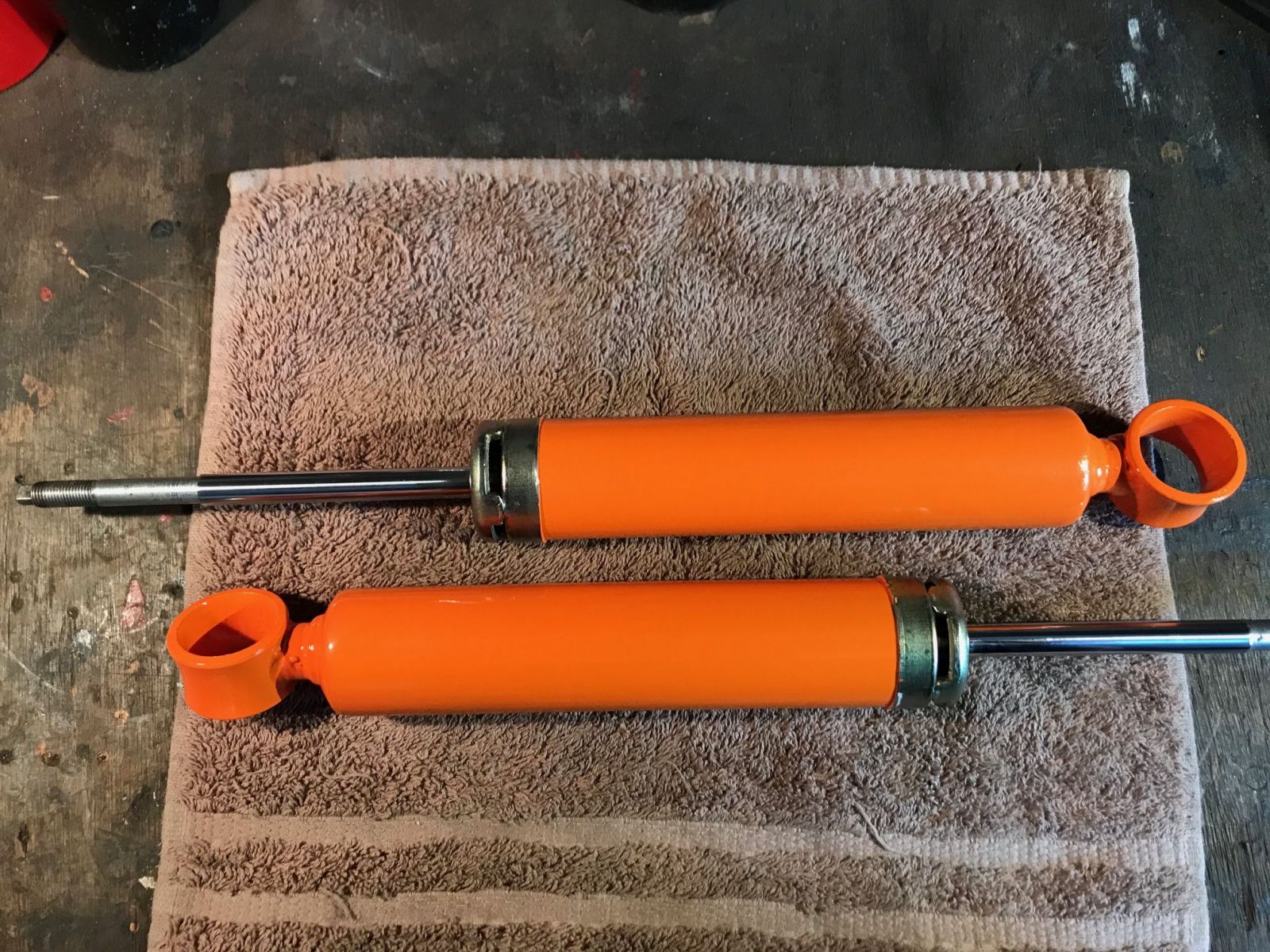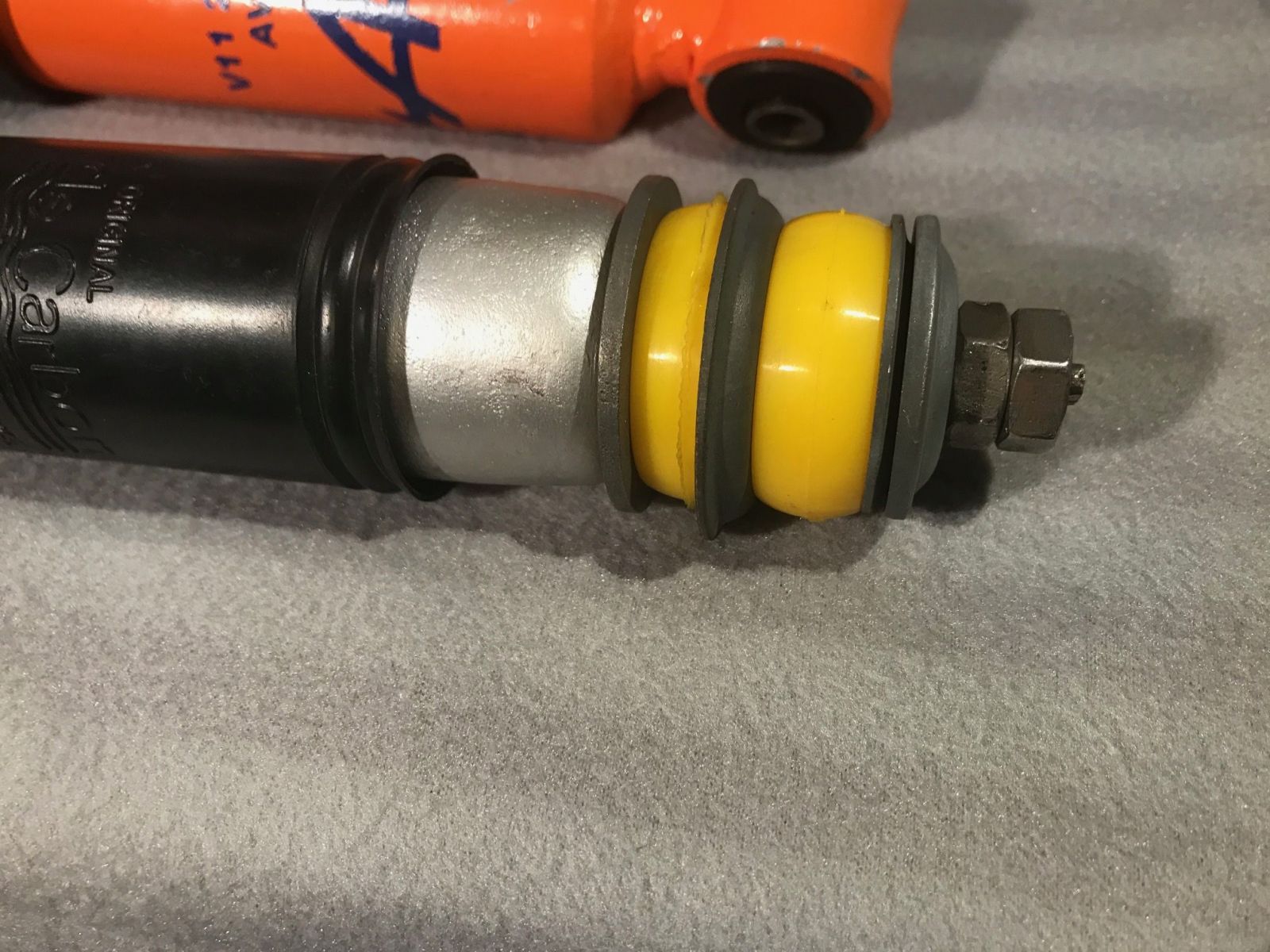 Első lépésben leteszteltem, hogy egyáltalán jók-e? Érdemes-e megmenteni őket? A teszteken szerencsére jól vizsgáztak, így elkezdődhetett a restaurálási folyamat. Első körben, körbe fotóztam, színmintát vettem, majd szétszedtem és lecsiszoltam, nem volt nehéz dolgom mert szinte magától lemállott a gátlókról a közel 40 éves festék. A képeket elküldtem egy grafikus barátomnak, hogy valamilyen módszerrel de fessük majd vissza a házra a logókat, feliratokat stb. Amíg ő dolgozott én addig kezelésbe vettem a gátlókat: kibányásztam a régi, elnyűtt gumi szilenteket és egy szegedi céggel a gyári adatok megadása után gyártattam bele két vadi új CNC megmunkált darabot. A gátlók zsírtalanítása és maszkolása után kapott egy réteg alapozó festéket és két réteg gyári deCarbon narancsot. Ezt a színt egy szintén szegedi, profi autófényezős boltban, minta alapján kevertettem ki, hogy teljesen gyári legyen. A dekoros barátom jelezte, hogy megvan a logókkal és a feliratokkal, hozhatom a gátlókat. Amikor viszont láttam őket majdnem leültem, annyira jól sikerült a logózás, mintha most csomagoltuk volna ki a gyári dobozából. Nem maradt más hátra mint összerakni az új szilentekkel és a korábban már legalvanizált alátétekkel és csavarokkal előkészíteni a beszerelésre. A torony felöli szilentek egyenlőre egy lada niva tuning darabjai mert nem találtam mást, de ezeket majd kifogom cserélni egy gyári szettre vagy legyártatom azokat is ha nem lesz más megoldás.