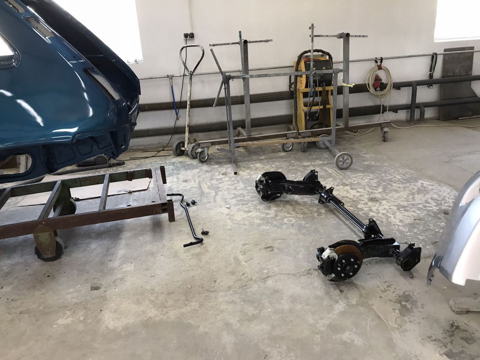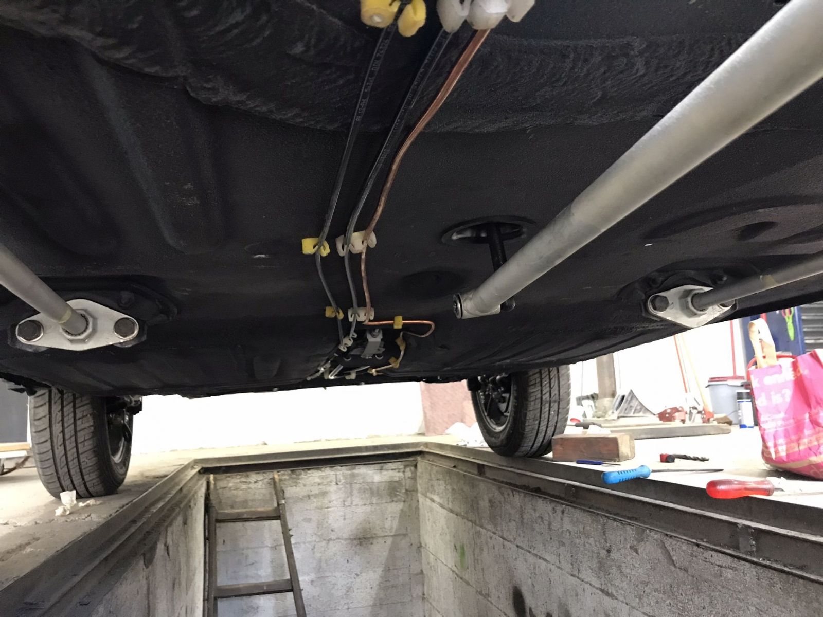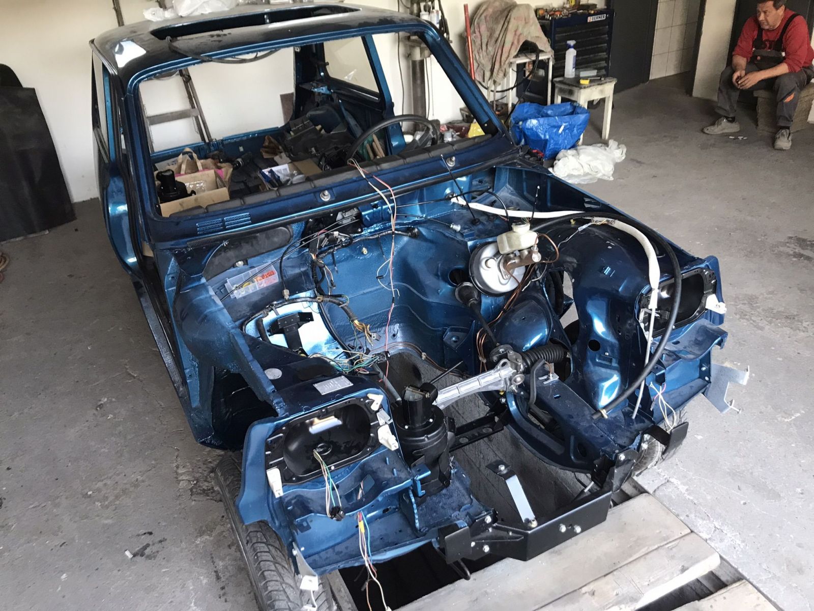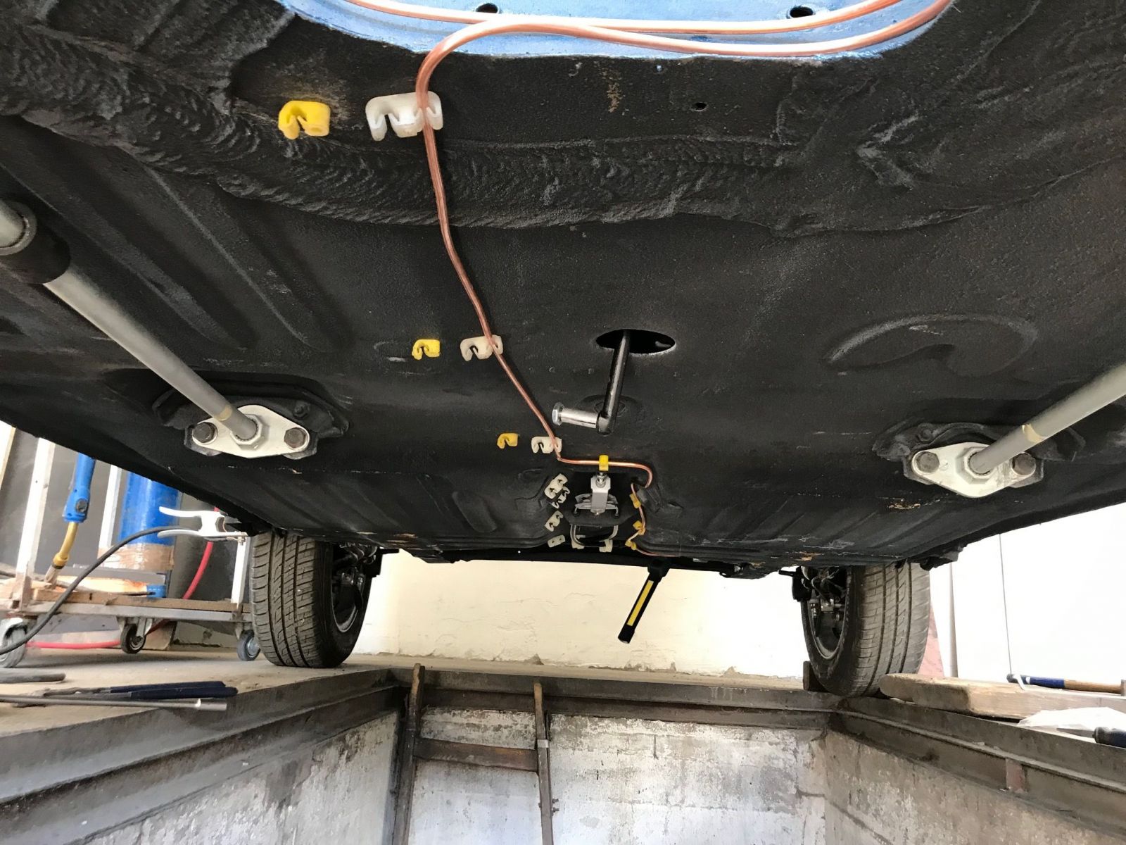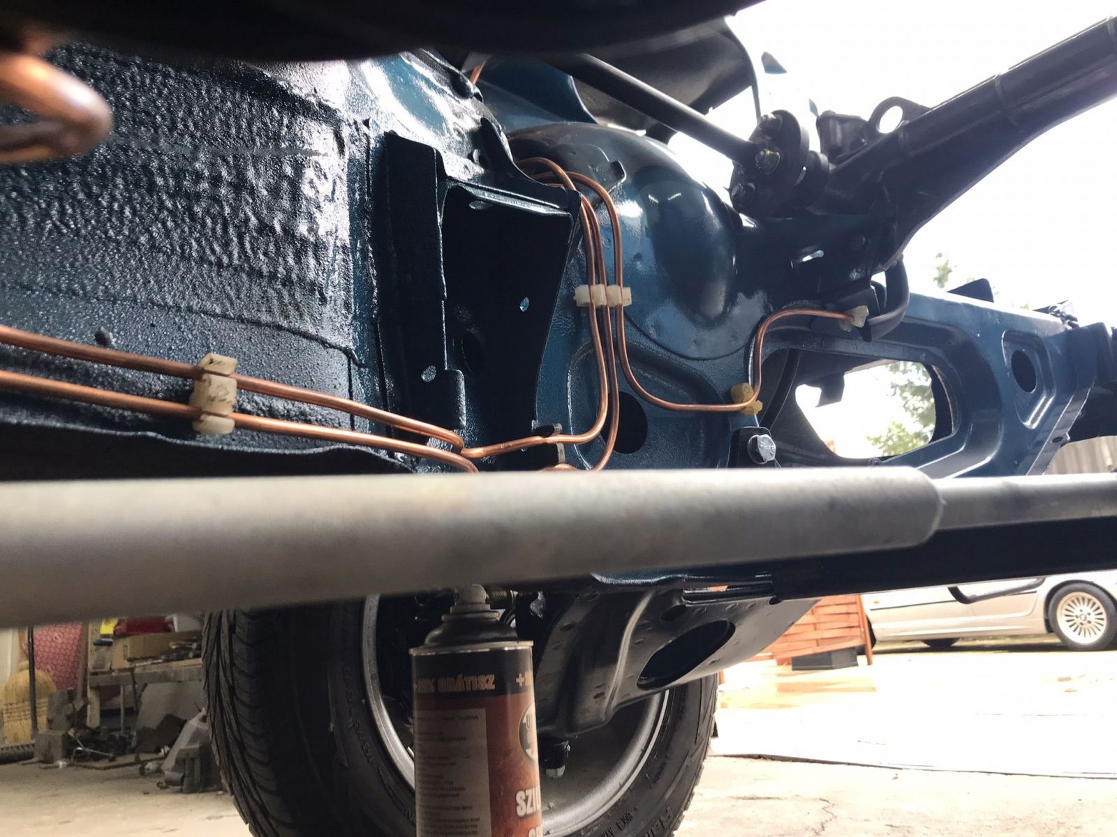 Miután megszáradt a festék, azonnal neki kellett állni az autó összeépítésének, ugyanis a fényezőműhelyben nem maradhatott sokáig. Az első futómű és hatalmas „küzdelem” árán a hátsó futómű visszaépítése után az autó immár újra gördíthetővé vált. Ekkor tréleren átkerült a kocsi Tibi barátom aknájára, ahol végre felkerült az üzemanyagtank, a fék és üzemanyagvezeték, a kézifék és egyéb csip-csup apróság ami a kocsi aljára kell. Ezután bekerült a kábelköteg és néhány gumikéder is. A hátsóablakok zsanérjait felszegecseltük valamint a nyitópántokat gyönyörű fekete csavarokkal rögzítettük. Vadiúj kédergumikat is kapott mind a két oldal, így már ismét nem fog beázni legalább 40 évig 😉 .
