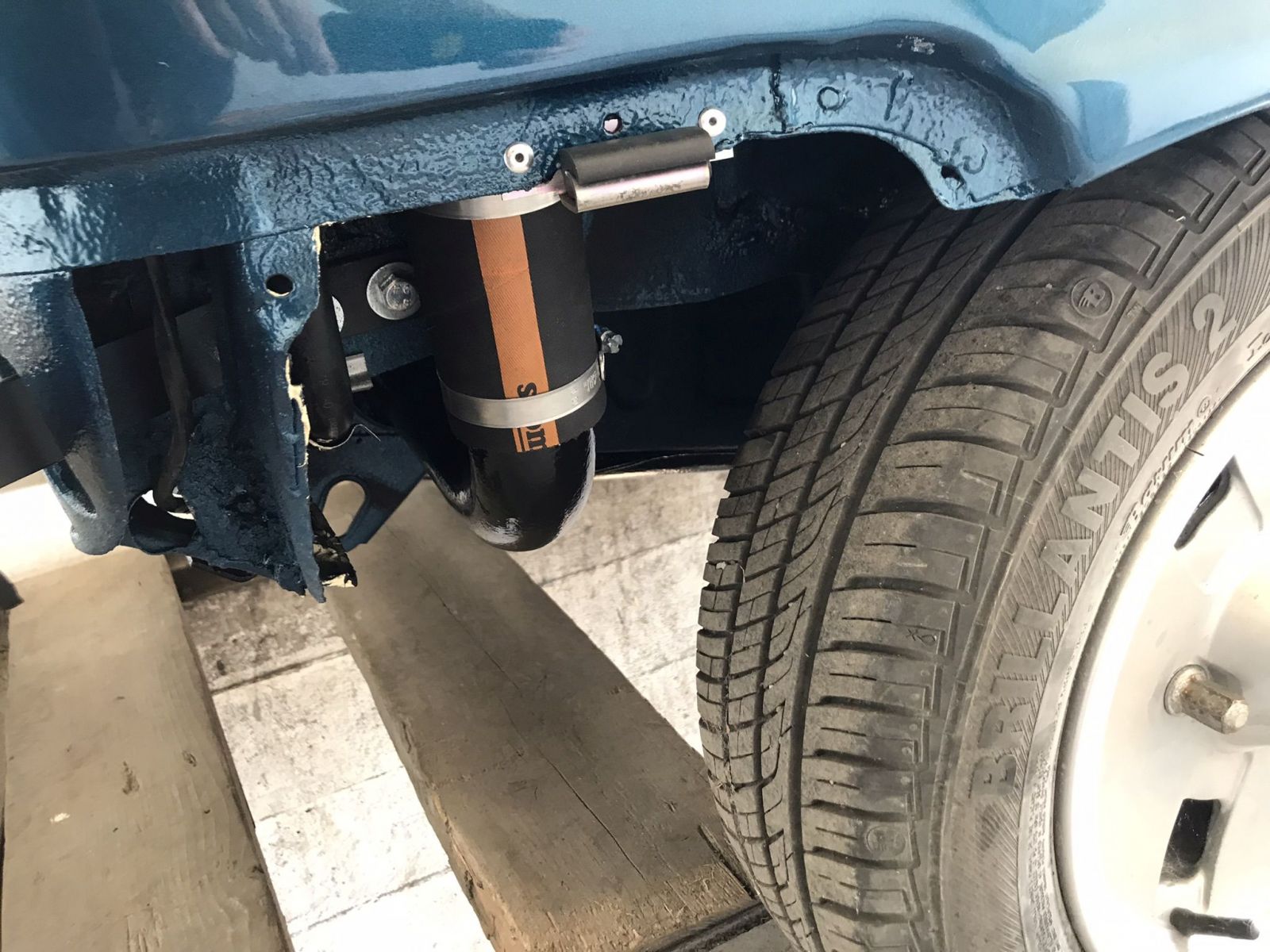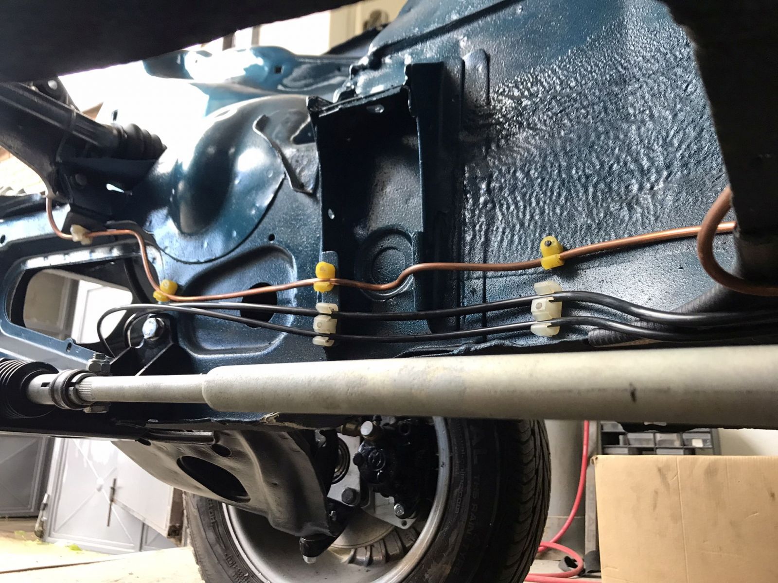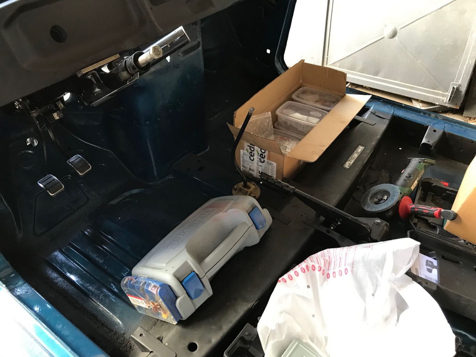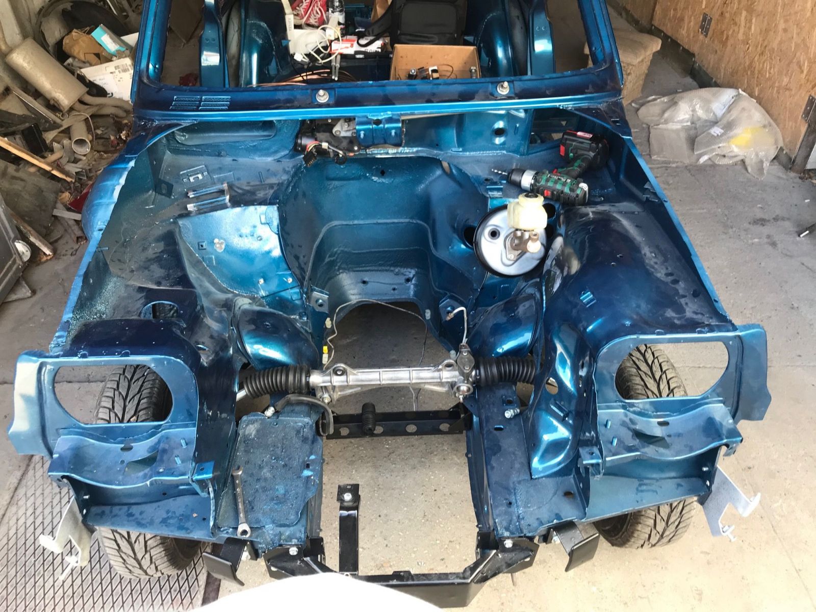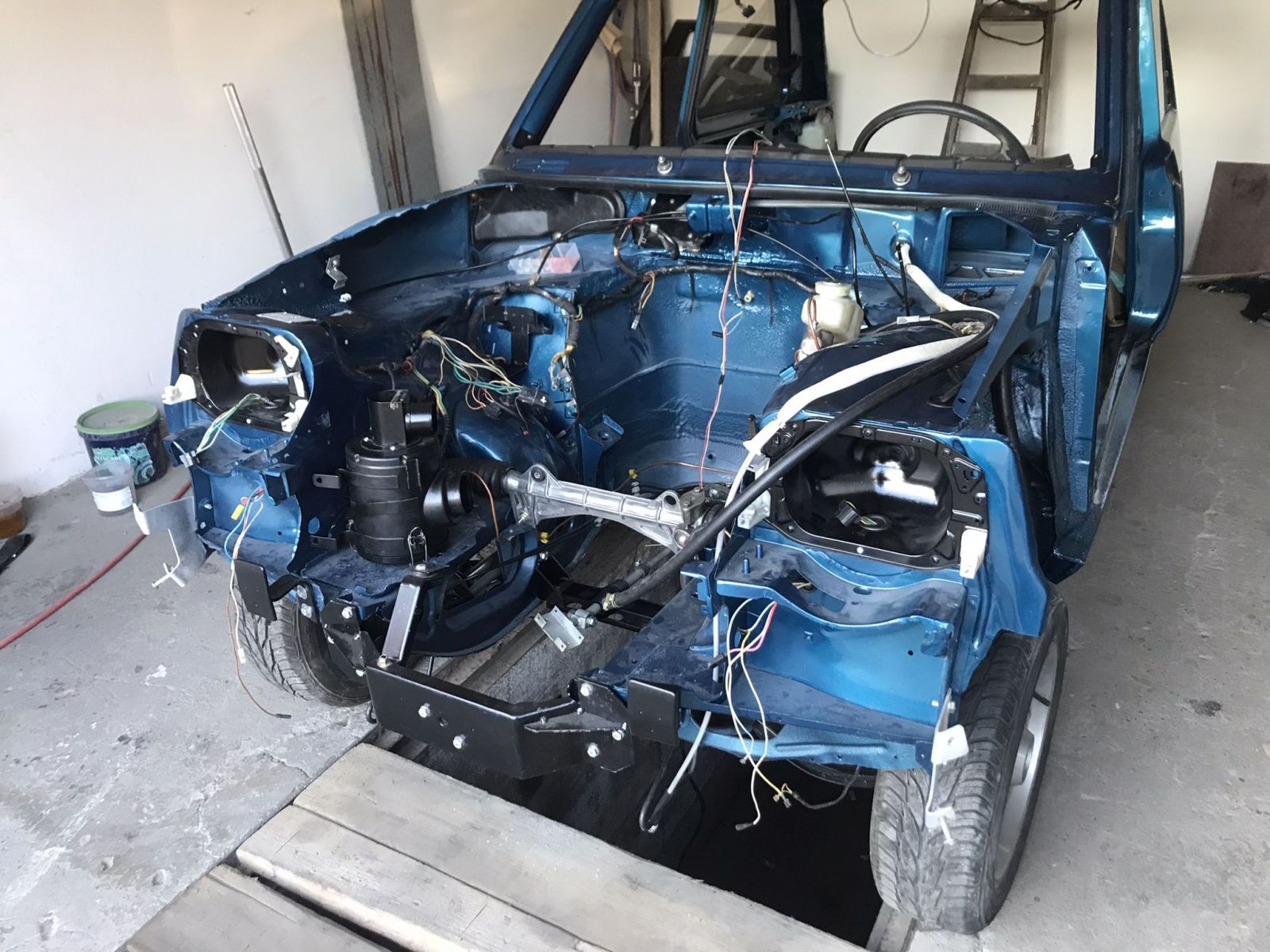 Miután megszáradt a festék, azonnal neki kellett állni az autó összeépítésének, ugyanis a fényezőműhelyben nem maradhatott sokáig. Az első futómű és hatalmas „küzdelem” árán a hátsó futómű visszaépítése után az autó immár újra gördíthetővé vált. Ekkor tréleren átkerült a kocsi Tibi barátom aknájára, ahol végre felkerült az üzemanyagtank, a fék és üzemanyagvezeték, a kézifék és egyéb csip-csup apróság ami a kocsi aljára kell. Ezután bekerült a kábelköteg és néhány gumikéder is. A hátsóablakok zsanérjait felszegecseltük valamint a nyitópántokat gyönyörű fekete csavarokkal rögzítettük. Vadiúj kédergumikat is kapott mind a két oldal, így már ismét nem fog beázni legalább 40 évig 😉 .