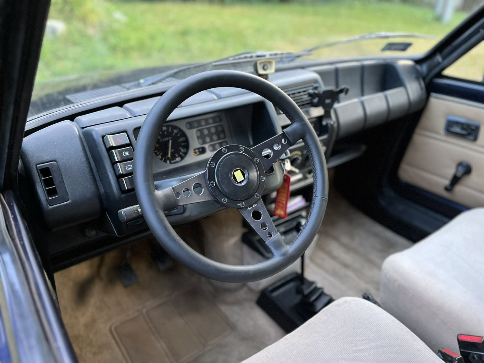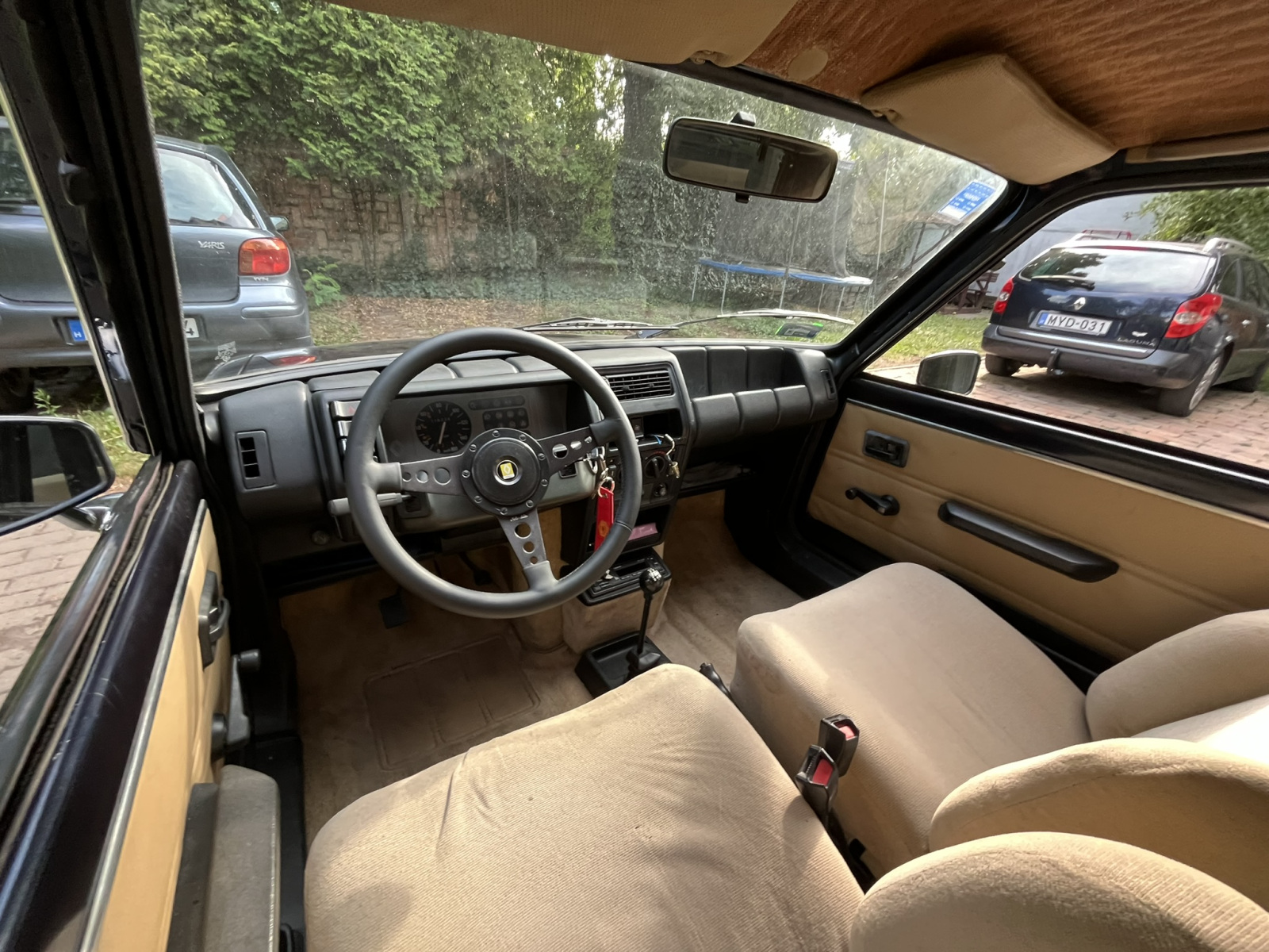 Így kapott, a gyári lehangoló fekete belső kárpitok helyett, egy vidám bézs Alpine Turbó belsőt, új vesetámaszos első üléseket, analóg kvarcórát, rádió boxot, új rádiót és hangszórókat, automata biztonsági öveket, több fokozatú ablaktörlőt és egy újrabőrözött, gyönyörű Moto-Lita kormányt.
